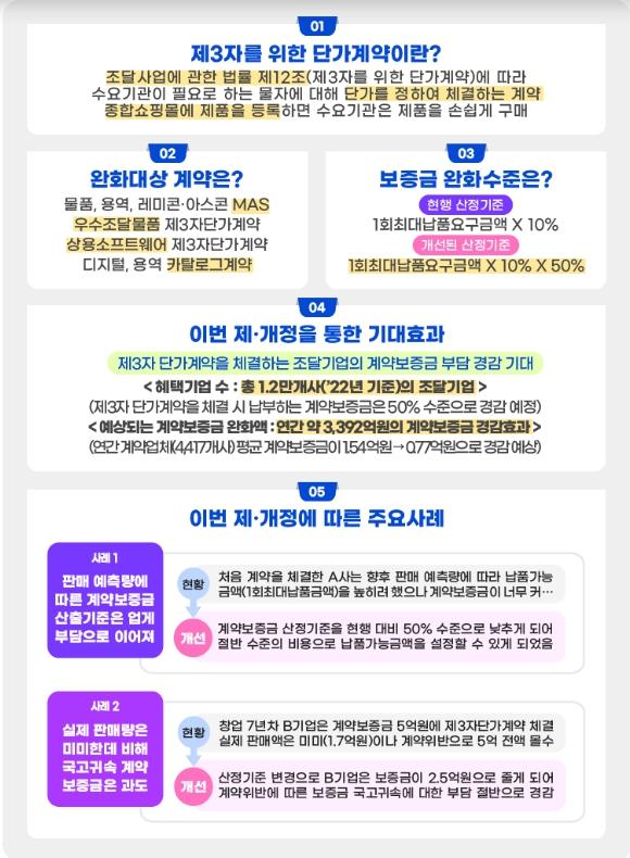 조달청은 조달기업이 ‘제3자를 위한 단가계약’을 체결 시 납부하는 계약보증금의 부담을 완화하기 위해 조달청 고시를 제정하고 7월 1일부터 시행한다.