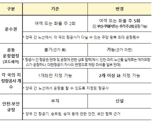 아울러, 2개 이상 국적사의 취항이 가능해졌으며(기존 한, 쿠 각 1개 제한), 항공협정에 안전·보안 강화를 위한 규정도 신설하기로 합의했다.