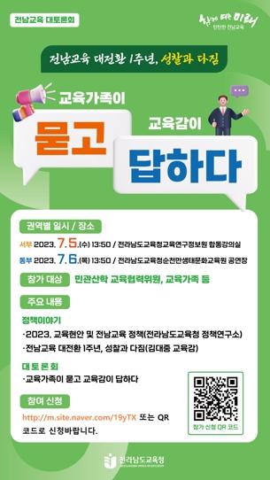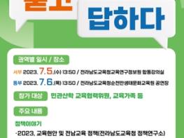 전라남도교육청은 주민직선 4기 출범 및 김대중 교육감 취임 1주년을 맞아 7월 5일 전라남도교육청교육연구정보원(서부권)과 7월 6일(목) 순천만생태문화교육원(동부권)에서 ‘전남교육 대토론회’를 개최한다.