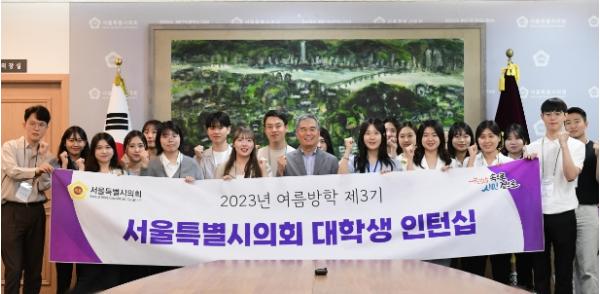 [중앙뉴스라인, 이승훈기자] 서울특별시의회가 서울 소재 17개 대학과 연계해 운영한 ‘제3기 대학생 인턴십’ 제3기 인턴 19명이 23년 7월 3일 오전 11시 김현기 서울특별시의회 의장 주관하에 오리엔테이션 행사를 치렀다.