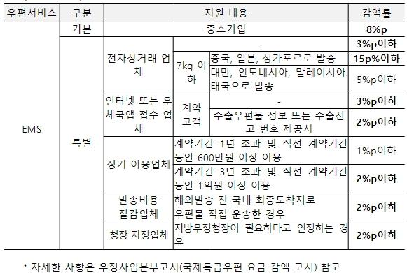 중소벤처기업부는 우정사업본부와 ’17년부터 국제특급우편(EMS) 요금 할인 업무협약을 체결해 중소기업의 물류비 할인을 지원해오고 있으며, 이번 협약으로 물류비 할인 지원이 계속될 예정이다. 중소기업 확인서를 발급받은 중소기업이라면 우체국 국제특송을 통한 물품 수출 시 일괄계약 국제특급우편(EMS)의 최대 감액률인 8%를 일괄 할인받을 수 있다.