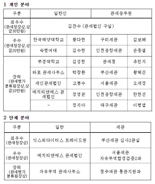 응시자 중 개인 15명(최우수 1, 우수 4, 장려 10) 및 단체 6팀(최우수 2, 우수 2, 장려 2)이 수상의 영예를 차지했고, 개인 최우수상은 김찬수(관세법인 구일)가, 단체 최우수상은 익스피다이터스 트레이드윈(일반), 부산세관 심사2관실(세관)이 수상했다. (붙임 참고)
