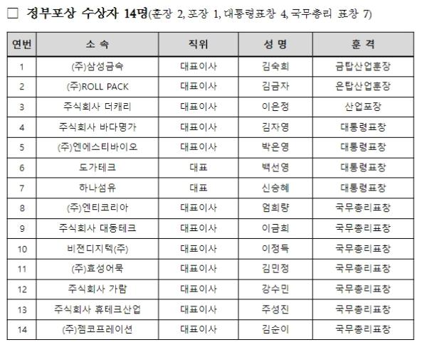 이와 함께 우수한 모범 여성기업인에게는 금탑훈장 등 총 14점 규모의 정부포상 수여도 진행됐다.