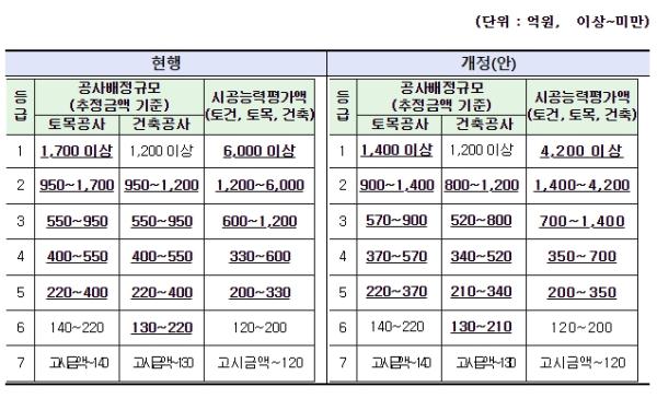 예를 들면 공사배정규모가 하위등급에 비해 지나치게 축소되어 있는 등급(토목·건축 4등급)의 공사배정규모를 조정했다.