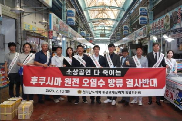 [중앙뉴스라인, 차행운기자] 전남도의회 ‘민생경제 살리기 특별위원회(위원장 김태균, 광양)’는 지난 10일 목포종합수산시장을 방문해 일본 후쿠시마 원전 오염수 방류 반대 캠페인을 진행하고 상인들의 현장의견을 청취했다.