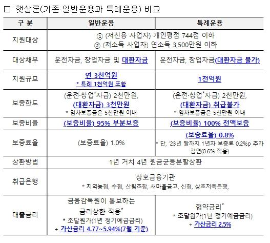 현행 사업자를 대상으로 하는 햇살론은 지역신용보증재단이 보증비율 95%, 보증료율 1% 조건으로 보증서를 발급하면, 저축은행 등 서민금융회사가 9% 내외의 금리로 대출을 시행해 왔는데,