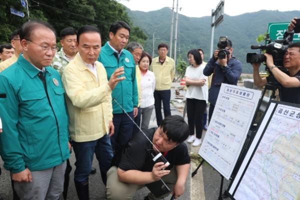 [중앙뉴스라인, 우제헌기자] 최근 사흘 간 괴산군에 400mm 넘는 비가 쏟아지며 피해가 잇따르자, 국회 정보위원장인 박덕흠 의원(보은?옥천?영동?괴산군, 국민의힘)은 16일 국민의힘 지도부와 함께 수해 상황을 살펴보고 긴급 대피한 주민들을 위로하고 나섰다.