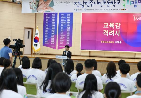 김대중 교육감은 격려사를 통해 “여러분에게는 변화를 만들어낼 무한한 가능성이 있으며, 오늘 그 가능성을 찾아 떠난다.”면서 “세계인의 마인드와 민주시민 의식을 배우며 꿈에 한 발짝 다가서는 소중한 경험, 가치 있는 체험으로 남겨오기 바란다.”고 당부했다.
