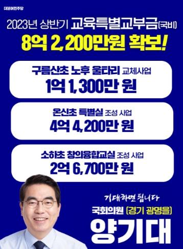 [중앙뉴스라인, 우제헌기자] 더불어민주당 양기대 국회의원(경기광명을)이 2023년도 상반기 국비인 교육특별교부금으로 초등학교 3개 사업, 총 8억 2,200만 원을 확보했다고 17일 밝혔다.