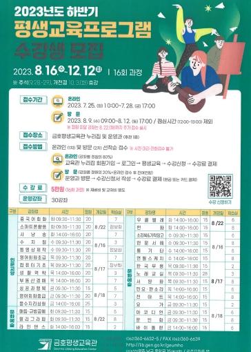 [중앙뉴스라인, 김병연기자] 금호평생교육관이 2023년도 하반기 평생교육 프로그램 수강생을 모집한다.