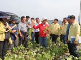 박덕흠 위원장은 논콩의 주산지인 괴산군 불정면에서 장맛비가 주춤한 사이 고온 다습한 날씨가 이어지면서 각종 병해충 초기 증상이 발생한 것을 확인하고, 해당 농가들에 신속한 방제작업이 필요하다고 판단했다.