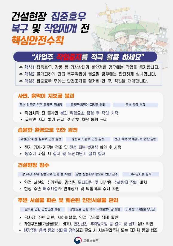 아울러 “폭우 뒤 폭염이 다시 찾아올 것으로 보이므로, 야외 복구작업 현장을 점검할 경우에는 온열질환 예방을 위한 안전보건수칙 준수 여부도 철저히 확인할 것”을 당부했다.
