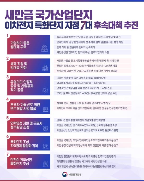새만금 국가산단에 최근 1년간 이차전지 기업들의 투자가 잇따르면서 6.6조 원이라는 대규모 투자유치 성과를 거둔 가운데, 지난 7월 20일 정부의 적극적인 지원으로 국가첨단전략산업의 전초기지인 ‘이차전지 특화단지’로 지정됐다.