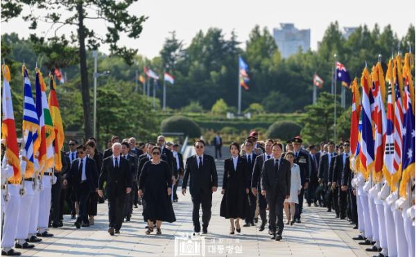 [중앙뉴스라인, 우제헌기자] 윤석열 대통령 부부는 7월 27일 오후 부산 유엔기념공원을 찾아 데임 신디 키로 뉴질랜드 총독 부부, 자비에 베텔 룩셈부르크 총리 등 유엔 참전국 정부대표단과 함께 유엔기념공원 내 상징구역에 있는 룩셈부르크 국기, 뉴질랜드 기념비, 영국군 전사자 묘역 및 유엔군 위령탑을 참배했다.