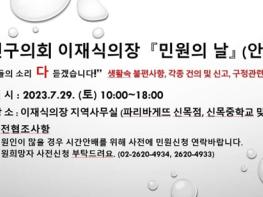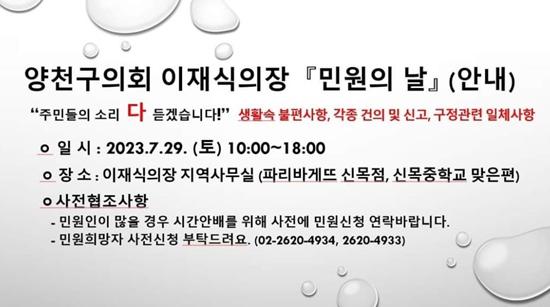 ‘민원의 날’ 행사는 양천구 목동에 있는 이재식 의장의 지역 사무실에서 오전 10시부터 오후 6시까지 진행된다.