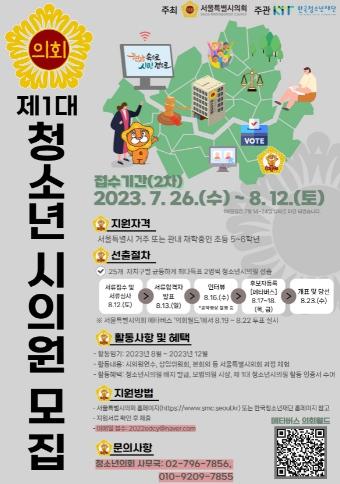 서울특별시의회 청소년 시의원 모집은 8월 12일(토)까지 진행되며, 8월 19일부터 22일까지 나흘간 시의회 메타버스 ‘청소년 의회월드’에서 선거인단에 의해 선거가 실시된다.