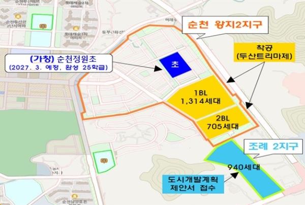 (가칭)순천정원초 학교 신설안은 순천 왕지2지구 및 조례2지구 2,959세대 도시개발 사업에 따라 유입되는 학생 적정 배치를 위해 추진됐다. 왕지2지구는 2,019세대 공동주택 입주가 2024년 11월부터 시작될 예정으로 학교 신설이 시급한 상황이었다.