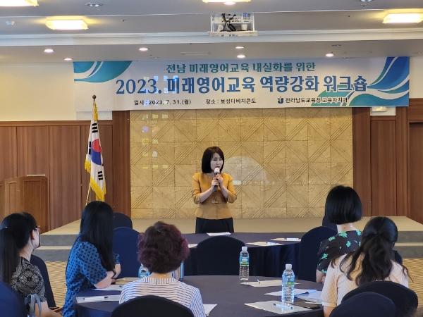 먼저, 7월 31일 보성 다비치콘도에서 인공지능(AI) 기반 영어과 수업 설계 연구회(12팀) 회원과 영어교육포럼 현장지원단 및 전남 초중등교원을 대상으로 미래영어교육 역량강화 워크숍을 열었다.