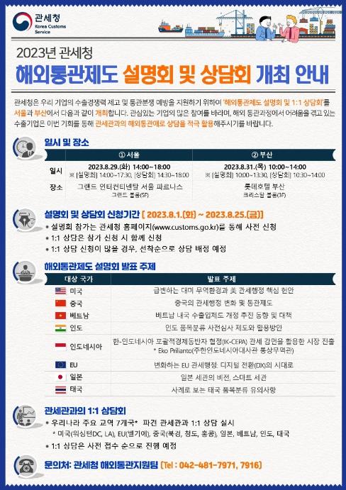 한편, 설명회 참여 기업은 현지 통관 어려움 등에 대해 관세관과 개별적으로 논의할 수 있는 '1:1 상담'도 신청할 수 있다.