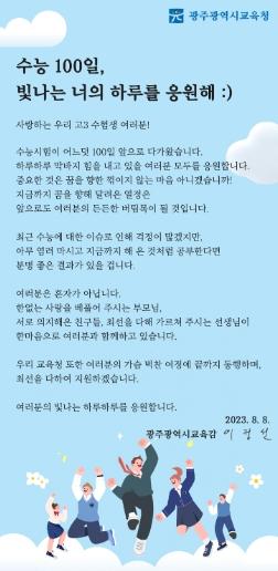 한편 이정선 교육감은 수능 D-100일인 8일에 고3 수험생을 위한 응원 편지를 전체 고등학교에 전달하고, 9일부터 직접 학교를 찾아 수험생을 격려할 계획이다.