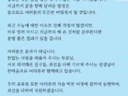 이 교육감은 수험생 응원 편지에서 “수능시험이 100일 앞으로 다가온 지금 막바지 힘을 내고 있을 수험생 모두를 응원하며 중요한 것은 꿈을 향한 꺾이지 않는 마음이다. 꿈을 향한 열정이 앞으로 든든한 버팀목이 될 것이다. 최근 수능에 대한 이슈로 인해 걱정이 많겠지만, 염려하지 말고 지금까지 해 온 것처럼 공부한다면 분명 좋은 결과가 있을 것이다. 교육청도 최선을 다해 지원하고 동행하겠다”고 전했다.