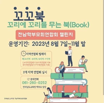 전남학부모회연합회(회장 최효진)가 2023년 연합회 특색사업인 ‘꼬꼬북(꼬리에 꼬리를 무는 BOOK) 챌린지’를 8월 7일부터 오는 11월 말까지 22개 지역학부모회연합회와 함께 실시한다.