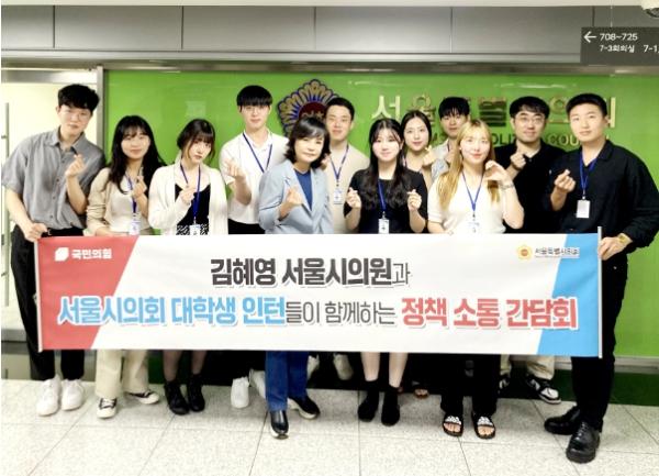 현재 서울특별시의회 대학생 인턴으로 활동 중인 서울 관내 대학생 10여명이 참석한 이번 간담회는 남다영 대학생 인턴(경희대 행정학과 4학년) 주도하에 평소 청년들이 생활하면서 느꼈던 애로사항 및 건의사항을 직접 청취하고 이를 서울시 정책에 반영하고 싶다는 김혜영 의원의 의지를 반영하고자 마련됐다. 서울시의회는 서울 관내 대학생들의 의정 참여 기회를 확대하고 진로 탐색 기회를 제공하기 위해 매 방학 기간마다 '서울특별시의회 대학생 인턴십' 프로그램을 운영하고 있다.