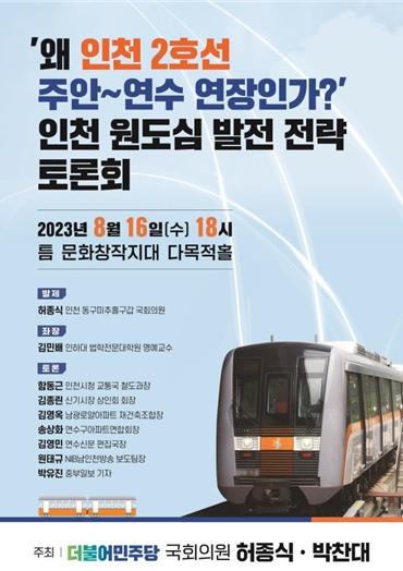 더불어민주당 허종식(인천 동구미추홀구갑)·박찬대(인천 연수갑) 국회의원은 16일 18시 미추홀구 문화창작지대 틈(미추홀구 미추홀대로 691) 다목적홀에서 “‘왜 인천 2호선 주안~연수 연장인가?’ 인천 원도심 발전 전략 토론회”를 개최한다고 밝혔다.?