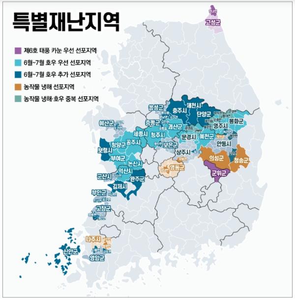 아울러, 지난 7월 호우 피해지역 중 충북 충주시 등 7개 시?군 및 20개 읍?면 지역도 이번 특별재난지역으로 추가 선포됐다.