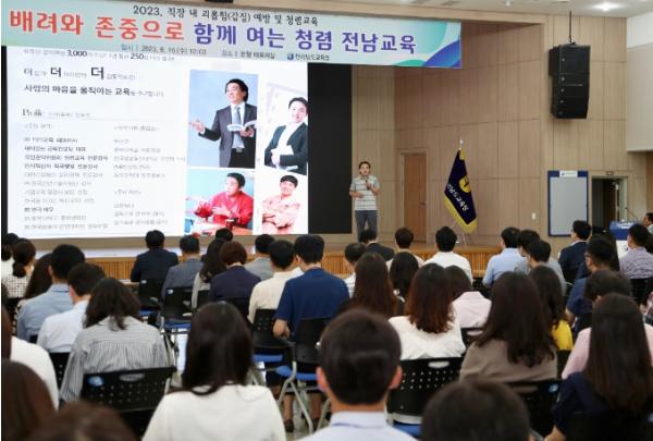 [중앙뉴스라인, 차행운기자] 전라남도교육청이 8월 16일 오전 청사 2층 대회의실에서 본청 전 직원을 대상으로‘2023년 직장 내 괴롭힘(갑질) 예방 청렴 교육’을 실시했다.