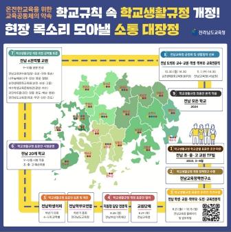 전남교육청은 이번 ‘소통 대장정’을 통해 22개 시·군 생활교육 담당 장학사, 교원단체, 전남학생의회, 전남학부모연합과 만남을 갖고 학교생활규정 개정 표준안 내용과 관련한 협의 절차를 거칠 예정이다.