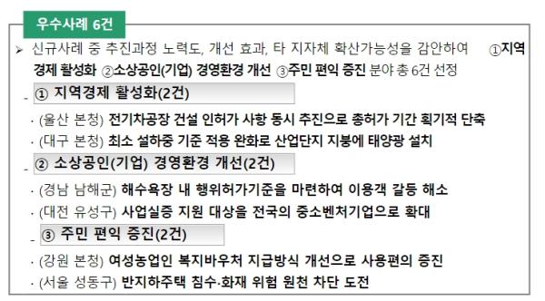 이번에 선정된 우수사례는 ?지역경제 활성화 2건(울산, 대구) ?소상공인(기업) 경영환경 개선 2건(경남 남해군, 대전 유성구) ?주민편익 증진 2건(강원, 서울 성동구) 등 3개 유형 총 6건으로 사례별 내용은 다음과 같다.