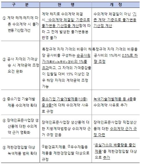 앞으로는 계약 해제·해지에 따른 수의계약 시 ‘기존 계약일’을 기준으로 물가변동에 따른 계약금액 조정을 할 수 있도록 개선된다.