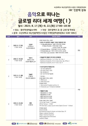 우선 17일에는 소프라노 김선희 조선대 외래교수가 푸치니의 오페라 ‘라보엠’을 주제로 강연한다. 다음날인 18일 강연에서는 피아니스트 박은식 전남대 교수가 ‘독일음악의 전통과 루드비히 반 베토벤’라는 주제를 통해 베토벤 소나타를 통해 독일의 음악적 특성에서 관해 알려준다. 21일에는 지휘자 김병무 호남신학대 교수가 ‘러시아 음악의 계보를 잇다’란 주제로 러시아 민요와 유명 음악가에 대해 개괄적으로 설명하는 시간을 갖는다. 마지막 날인 22일에는 변욱 지휘자가 ‘베를린의 울림’을 주제로 베를린필하모니에 대해 소개한다.