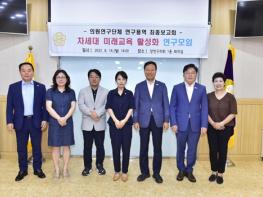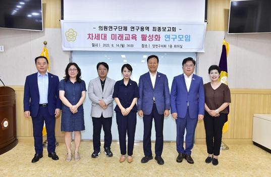 “차세대 미래연구 활성화 연구모임”은 김수진 대표의원을 비롯하여, 이재식 의장, 정택진 의원, 공기환 의원, 임준희 의원, 최혜숙 의원, 신우정 의원 등 7명으로 구성된 의원연구단체로, 지난 4월부터 연구를 진행해 왔으며 연구결과는 정책 제안 및 조례 제·개정 등 의정활동에 적극적으로 활용될 예정이다.