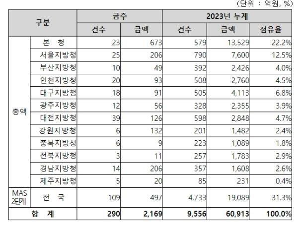 지역별 발주량을 보면, 총액계약 대상 1,672억 원 중 본청이 673억 원으로 40.3%를 집행하고 서울청 등 11개 지방청에서 999억 원을 각각 집행할 예정이다.