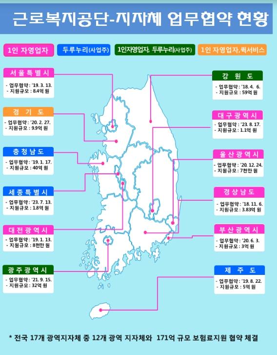 공단은 2018년 강원도를 시작으로 지난 5년간 12개 광역단체 및 8개 기초단체와 업무협약을 체결하여 연간 171억 원 상당의 보험료를 지원함으로써 사회보험 사각지대 해소와 소상공인 경영 부담완화에 힘쓰고 있다.