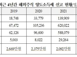 신고한 양도차익은 6조7180억원으로 21년(2조9264억원)보다 130%(3조7916억원) 급증했다. 해외주식을 96조7641억원에 취득해 103조8549억원에 매도한 것이다. 양도가액에서 취득가액을 뺀 양도차익은 7조908억원에 달한다. 양도세를 계산할 때는 거래세와 수수료를 필요경비로 차감한다. 3,728억원의 필요경비를 차감한 실제 양도차익은 6조7180억원으로 집계됐다.