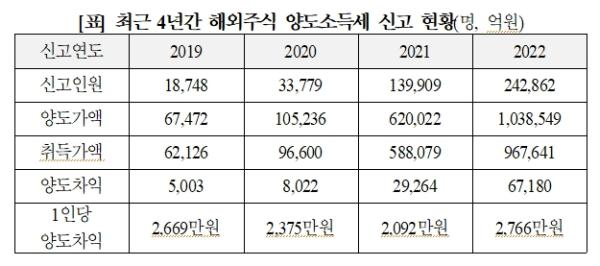 2020년부터 국내주식과 해외주식의 손실과 이익을 통산해 신고하므로 해외주식 양도세만 따로 집계되지는 않는다. 다만, 양도차익 중 250만원을 공제한 후 20%의 양도세를 부과하므로 1인당 503만원 정도의 양도세를 냈을 것으로 추산된다. 전체 신고인원이 24만명인 것을 감안하면, 합계 1조2천억 정도의 양도세를 냈을 것으로 보인다. 1년 전인 2021년 5천억 수준에서 2배 이상 급증했을 것으로 보인다.