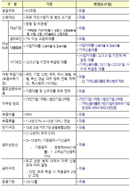 아울러, 기존 ?저금리 대환 프로그램?을 통해 보유 중인 5년 만기 대출(2년 거치, 3년 분할상환)도 8.31일부터 10년 만기 대출(3년 거치, 7년 분할상환)로 갱신할 수 있다.