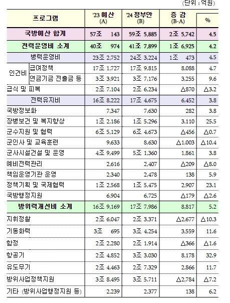 국방부, 2024년 국방예산, 전년 대비 4.5% 증가한 59.6조원