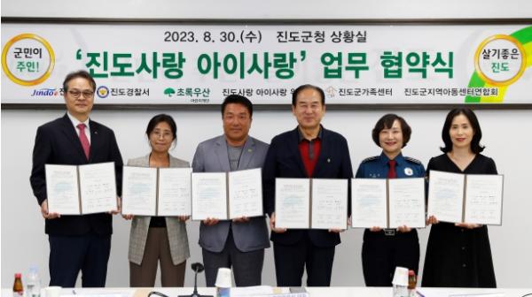 이날 업무협약식에는 진도군, 진도경찰서, 초록우산어린이재단 전남지역본부, 진도사랑 아이사랑 추진 위원회, 진도군 가족센터, 진도군 지역아동센터엽합회 등 6개 기관이 참여했다.
