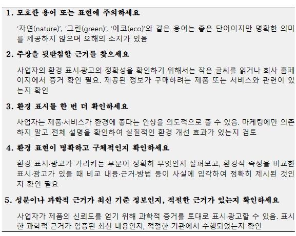 아울러, 친환경 표시?광고를 접한 소비자들은 그린워싱에 속지 않도록 특히 모호한 표현과 이미지에 주의할 필요가 있으며, 구체적인 범위와 근거가 있는지 확인할 필요가 있다.