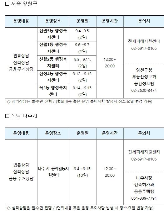 9월 4일부터는 지자체 수요 및 피해발생 현황 등을 종합 고려해 서울 양천 및 전남 나주에서 찾아가는 전세피해지원 상담소를 운영할 계획이다.