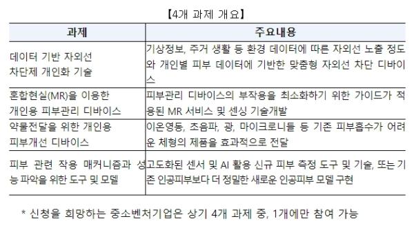 공모 과제로는 개인화에 기반한 ① ‘자외선 차단’, ② ‘혼합현실(MR) 기반 피부관리 디바이스’, ③ ‘피부개선 약물전달’, ④ ‘피부 관련 작용 메커니즘과 성능 파악 모델’이며, 중소벤처기업진흥공단과 로레알 코리아가 함께 선정한다.