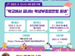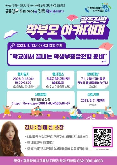 [중앙뉴스라인, 김병연기자] 광주시교육청이 오는 13일 19시 ‘학교에서 끝내는 학생부종합전형’이라는 주제로 제4차 광주진학 학부모 아카데미 특강을 교육연구정보원 1층 대강당에서 개최한다.