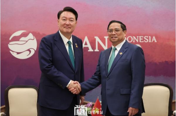 [중앙뉴스라인, 우제헌기자] 아세안 관련 정상회의 참석을 위해 인도네시아 자카르타를 방문 중인 윤석열 대통령은 오늘(현지시간, 9. 6, 수) 오후 '팜 밍 찡(Pham Minh Chinh)'베트남 총리와 양자회담을 가졌다.