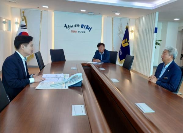 [중앙뉴스라인, 차행운기자] 전남도의회 교육위원회 박형대 의원(진보당·장흥1)은 6일 전라남도교육청을 방문해 김대중 교육감과 당면 교육 현안에 대해 협의 시간을 가졌다.