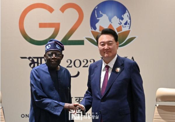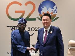 [중앙뉴스라인, 우제헌기자] G20 정상회의 참석을 위해 인도 뉴델리를 방문 중인 윤석열 대통령은 오늘(9. 9 토, 현지시간) 오후 '볼라 아흐메드 티누부(Bola Ahmed Tinubu)'나이지리아 대통령과 정상회담을 가졌다.