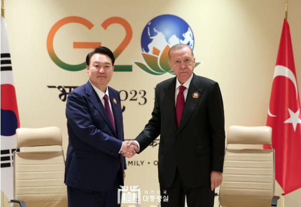 [중앙뉴스라인, 우제헌기자] G20 정상회의 참석차 인도 뉴델리를 방문 중인 윤석열 대통령은 오늘(현지시간 9. 9, 토) 오후 '레젭 타입 에르도안(Recep Tayyip Erdo?an)' 튀르키예 대통령과 정상회담을 가졌다.